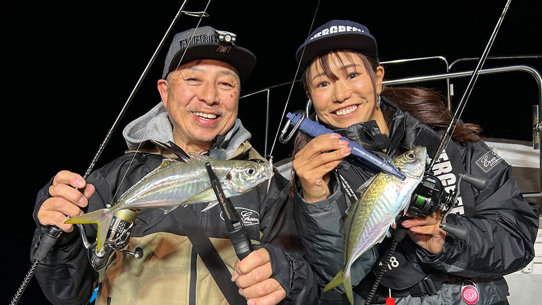 今回はエバーグリーンインターナショナルの豊西和典さんとあやかちゃんが和歌山県田辺市へ。シーホースさんにお世話になり、バチコンアジングを楽しみます。使用するロッドは超高感度のバチコン専用ロッド。ベイトモデルとスピニングモデルの「ディープセンスS」を使い分け、30cmオーバーの“尺アジ”を狙っていくことに。ワームは2.5インチから使っていきます。