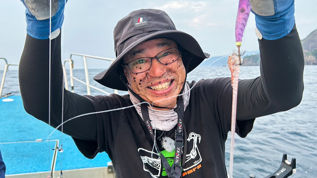 早朝、意気揚々と出船しますが強風とうねりで海は大荒れ。お昼が近づくに連れ、さらにうねりは増していきます。10グラムのシンカーを装着してスタートしますが全く歯が立たず、80グラムのシンカーを使ってなんとかエギを沈めます。しかし、そんな悪天候の中、2人とも見事な釣果を叩き出します。